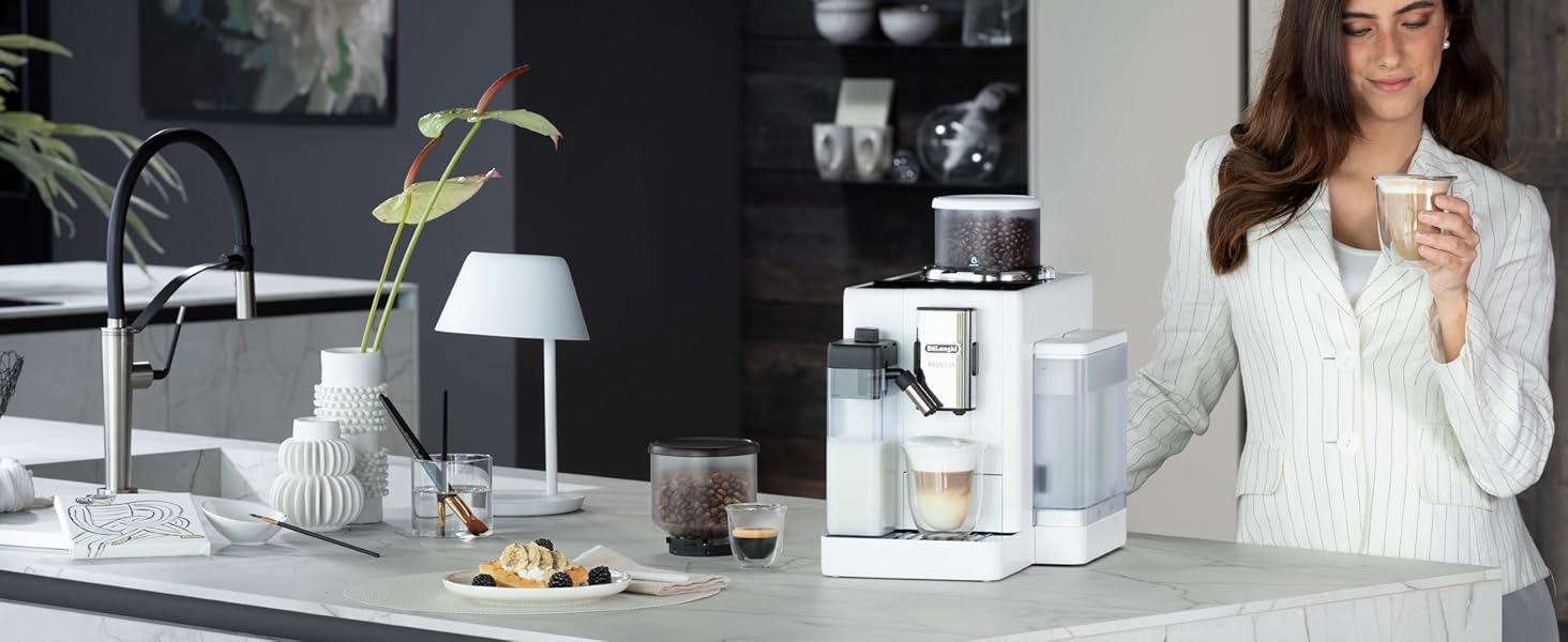 Home / Coffee Machine / De'Longhi Rivelia Perfetto EXAM440.55.W Automatic Coffee Machine, Freshly Ground Beans, Interchangeable Bean Holder, Automatic Milk Frother Jug, Colour Touch Display