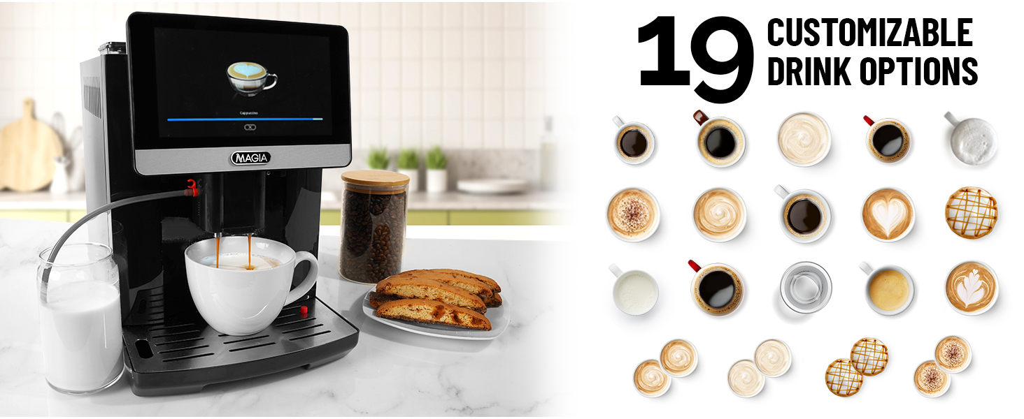 • 19 COFFEE RECIPES: Discover a world of coffee possibilities with 19 diverse options, including latte, cappuccino, Americano, macchiato, flat white, espresso, and many more with our fully automatic espresso machine. Whether you prefer using fresh coffee beans or pre-ground coffee, this super automatic espresso machine accommodates both, ensuring you can enjoy a wide variety of beverages tailored to your taste.
