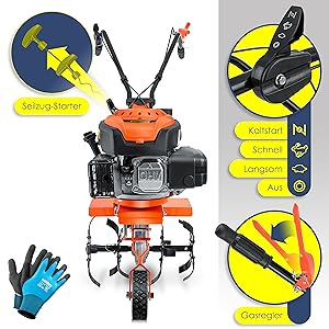 The powerful 4-stroke garden hoe has been developed with ideally matched components and can thus work even on the hardest soils smoothly and quickly. Thanks to the self-propulsion that can be activated with forward gear, you work quickly and efficiently. Whether you want to work close crops or small, medium or large areas, this soil milling machine will become your "best friend in the garden" and can be used for all surfaces.