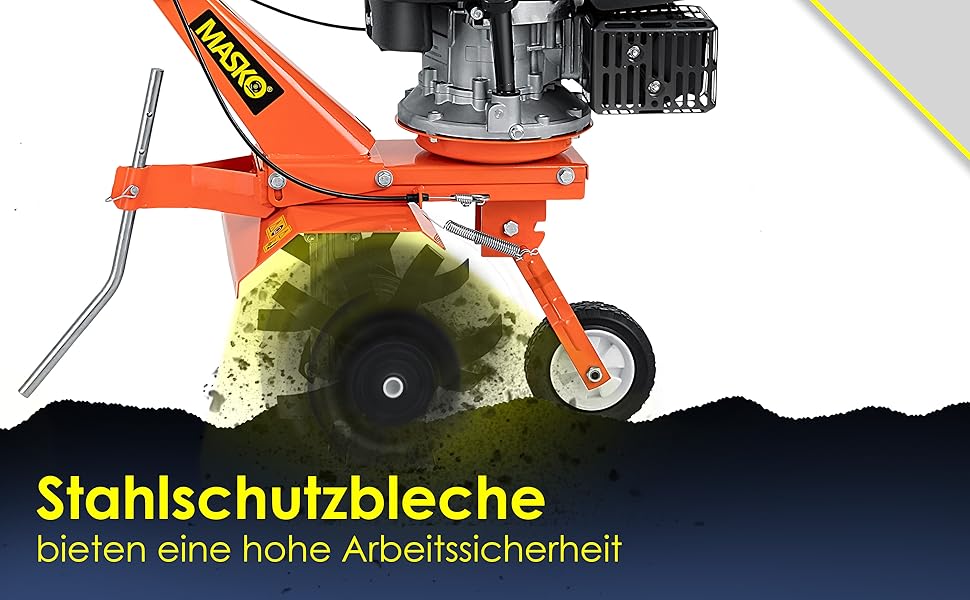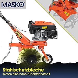 MASKO garden tiller with foldable transport wheel, steel protection plates, cable starter and a 4-stroke engine.