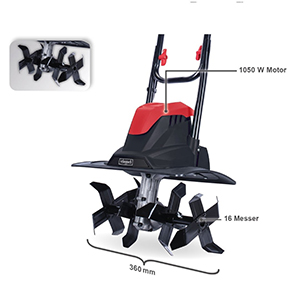 The handy electric tiller is equipped with a powerful 1050 watt motor so as not to expose the user to harmful exhaust gases during gardening work. Compared to a gasoline-powered garden tool, the tiller requires significantly less maintenance.