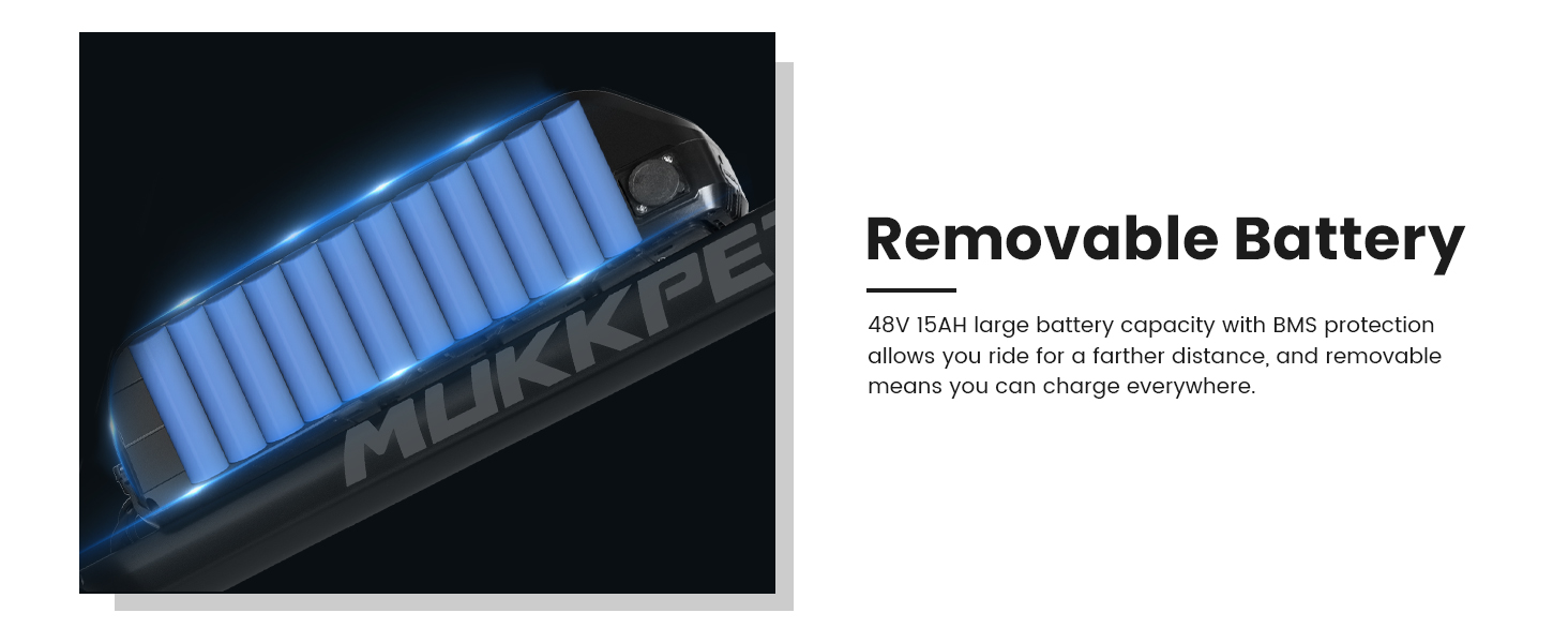 【High Performance Battery】High-capacity 48V 15AH battery provides the mountain ebike with long range up to 45+ miles per charge (PAS 1). In addition to the range, we also guarantee the safety of the battery, which is protected by Mukkpet's exclusive BMS technology, making it much more stable and safe. In addition, the key will firmly lock the battery to the frame, do not worry about it easily dropped or being stolen.