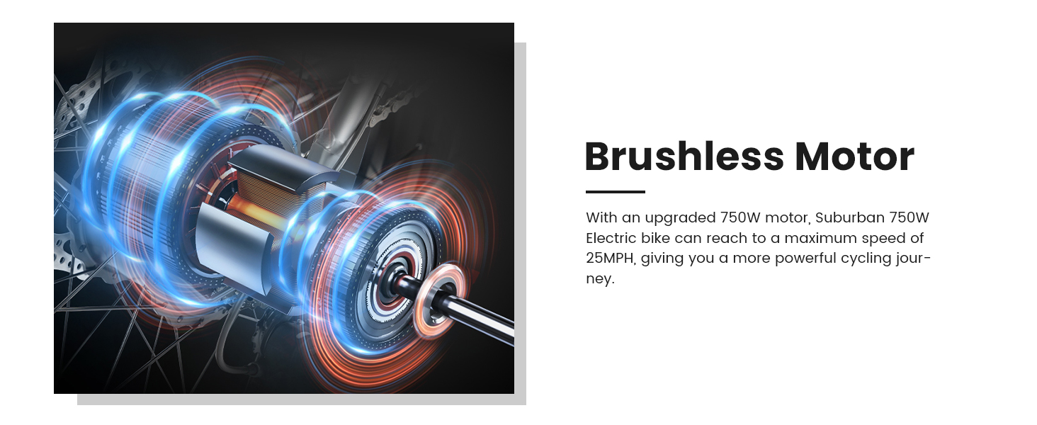 【750W Powerful Motor】 Mukkpet Suburban 750W adult electric bike is equipped with a 750W high speed brushless motor. It allows the ebike to meet any rider's needs. The powerful motor enables speeds of up to 25MPH. Whether road, grass, sand or mountain, Suburban can conquer all terrains and is one of your best essential travel choices.