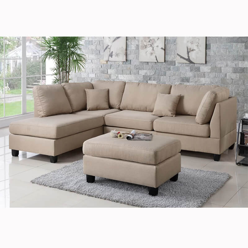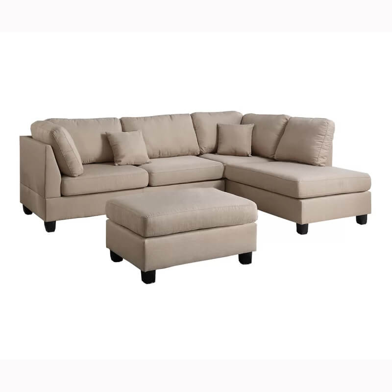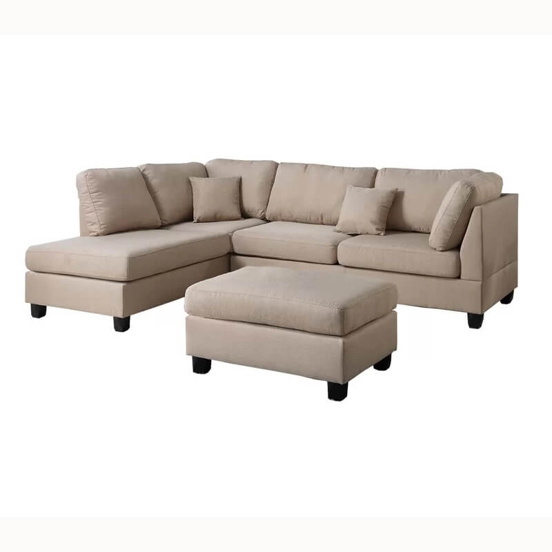 A contemporary update on a classic design, this sectional and matching ottoman set anchors any living room or den in transitional style. Founded on a solid pine wood frame, this dapper design strikes a spacious L-shaped silhouette with a wedge-shaped back and chiseled resin feet. Available in a curated selection of fashionable colors, designer polyester upholstery envelops the sofa for a linen-like feel, while pocketed springs and foam cushioning offers comfortable support.