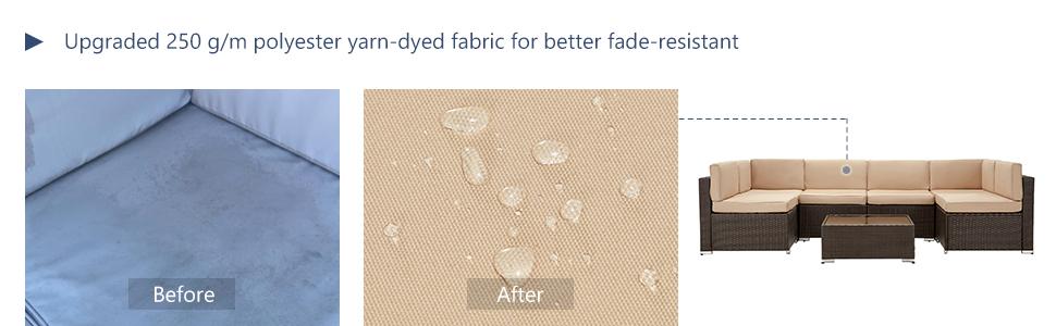 Thicker Padded Cushions 3.5' thick padded cushions for optimal comfort and relaxation, zippered cushion covers for easy washing. Waterproof cushion cover for your new choice for indoor or outdoor design. Heavy-Duty Construction Our 7-Piece Outdoor Sectional Wicker Set is built to last. Featuring a rust-resistant sturdy steel frame and high-quality hand woven PE wicker which will make it a mainstay in your backyard for years. Elegant Coffee Table Tempered Glass-topped coffee table has great ability to resist any crush and scratch and provides a perfect platform for drinks and food. Raised adjustable feet offers extra stability. Durable Fastener Clips Extra sofa fastener clips with high quality material help to prevent the movement between sofas to maintain good look of patio furniture set.