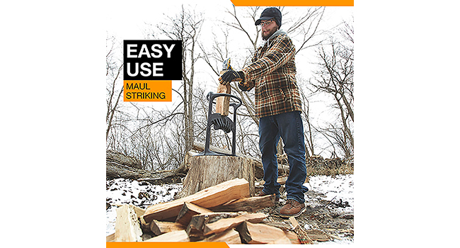 • Just place a piece of firewood inside the 9in. dia. iron safety ring and firmly strike it with a blunt instrument, such as a hammer, mallet or even another piece of wood, easily driving the wood down onto the stationary wedge head